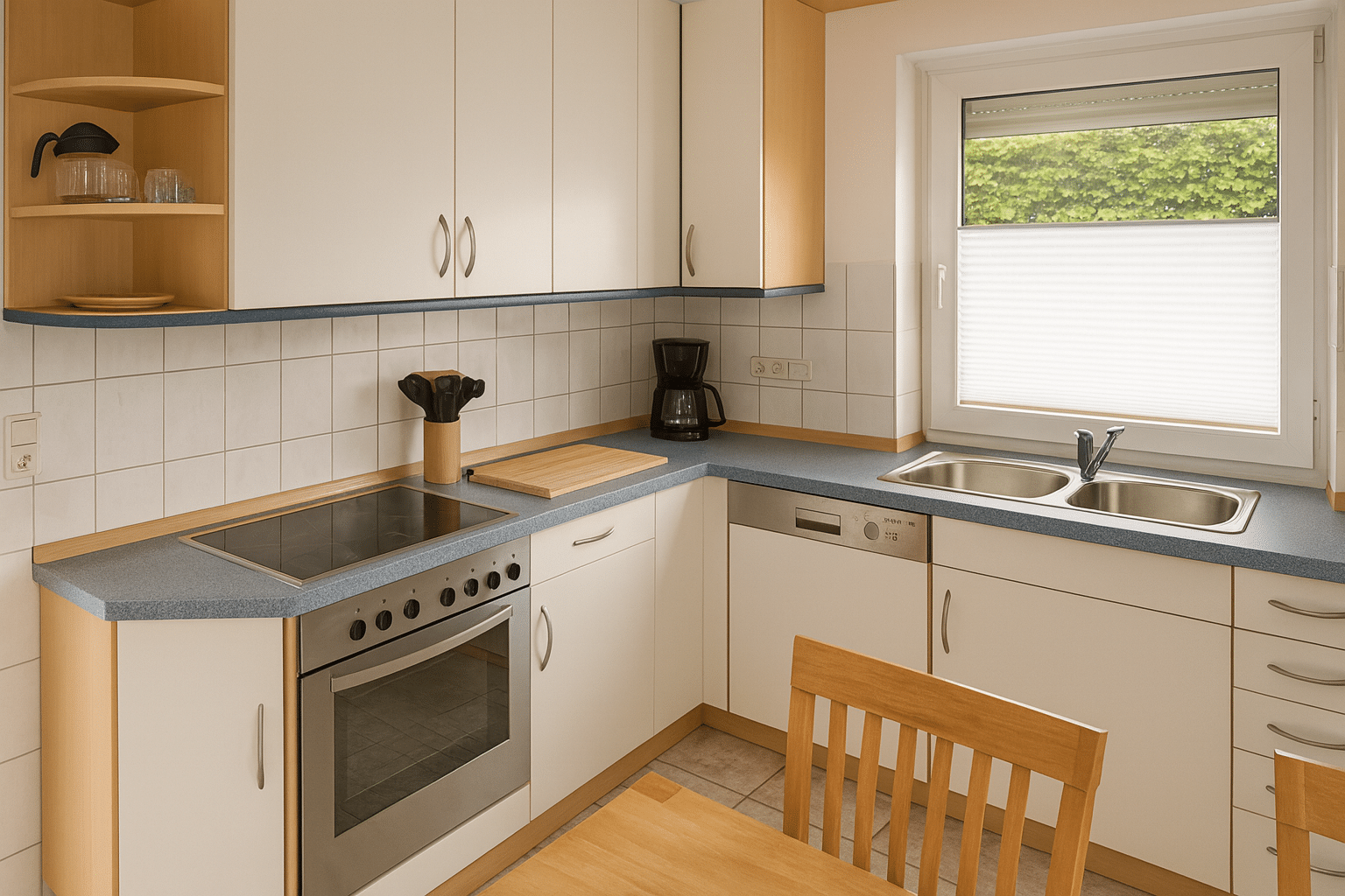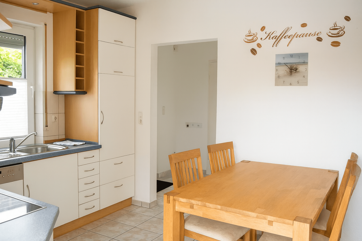 - Sehr komfortabel und voll ausgestattete Einbauküche, mit integriertem Essbereich und direktem Zugang zur großen Terrasse (Südseite).