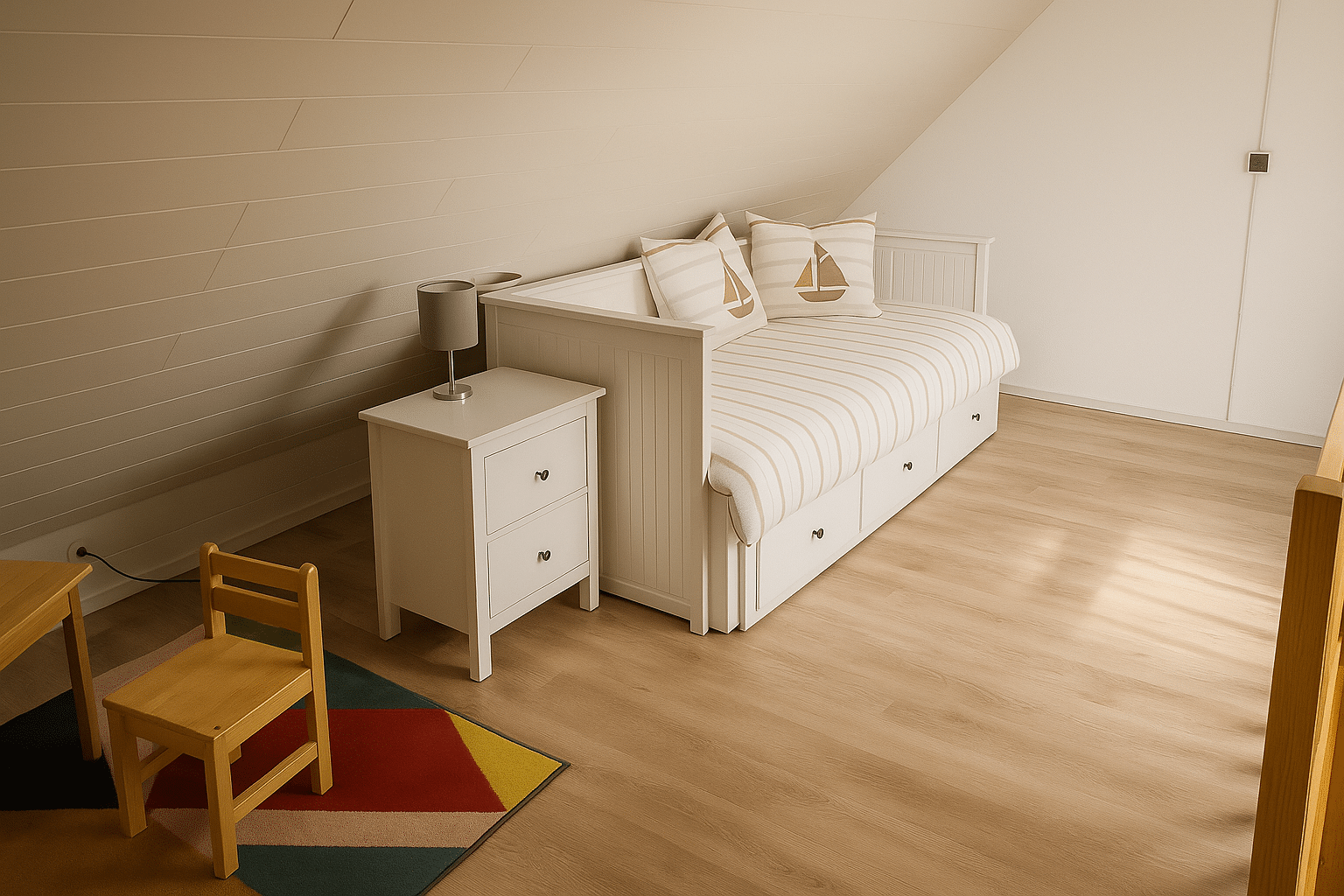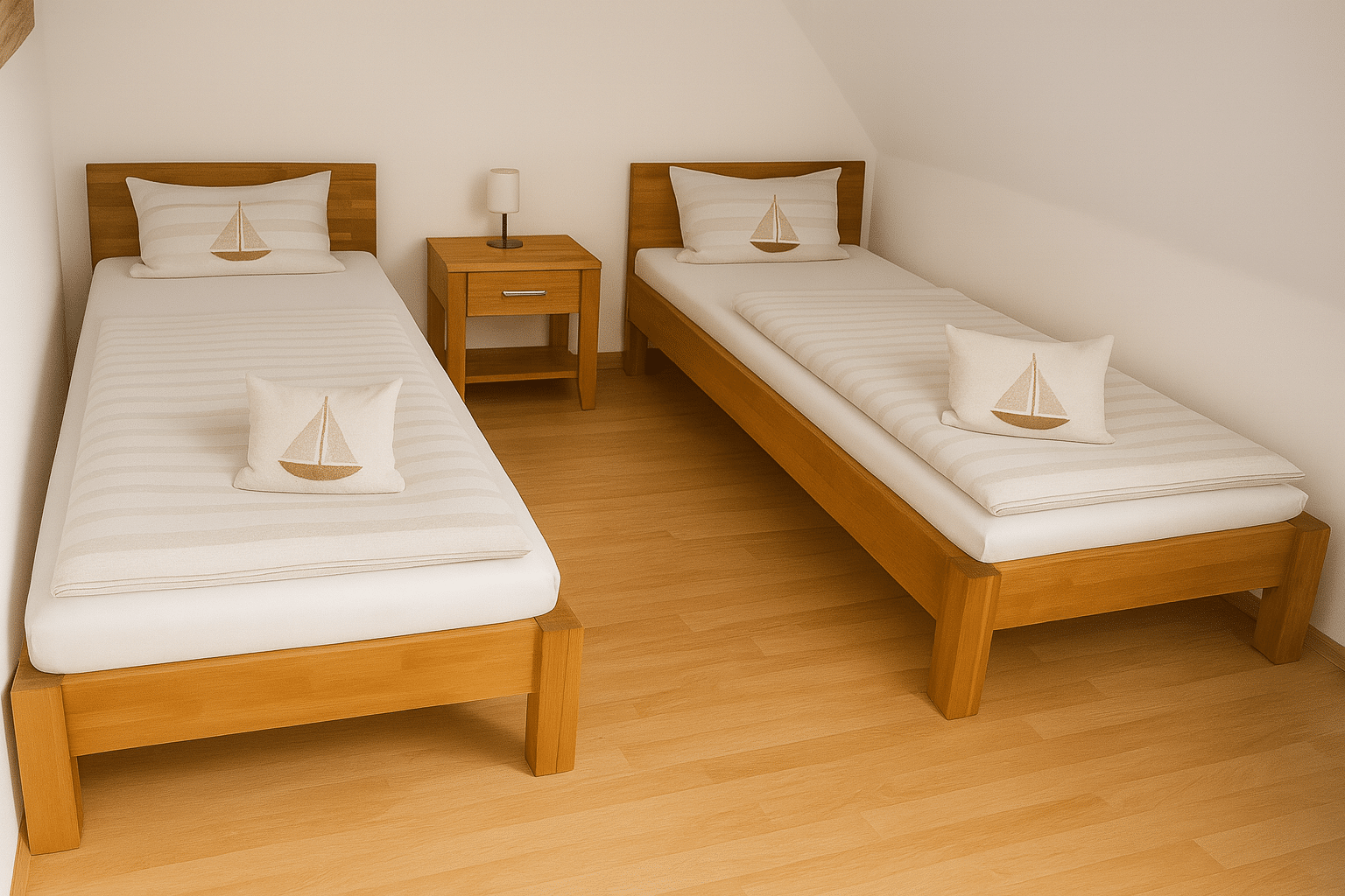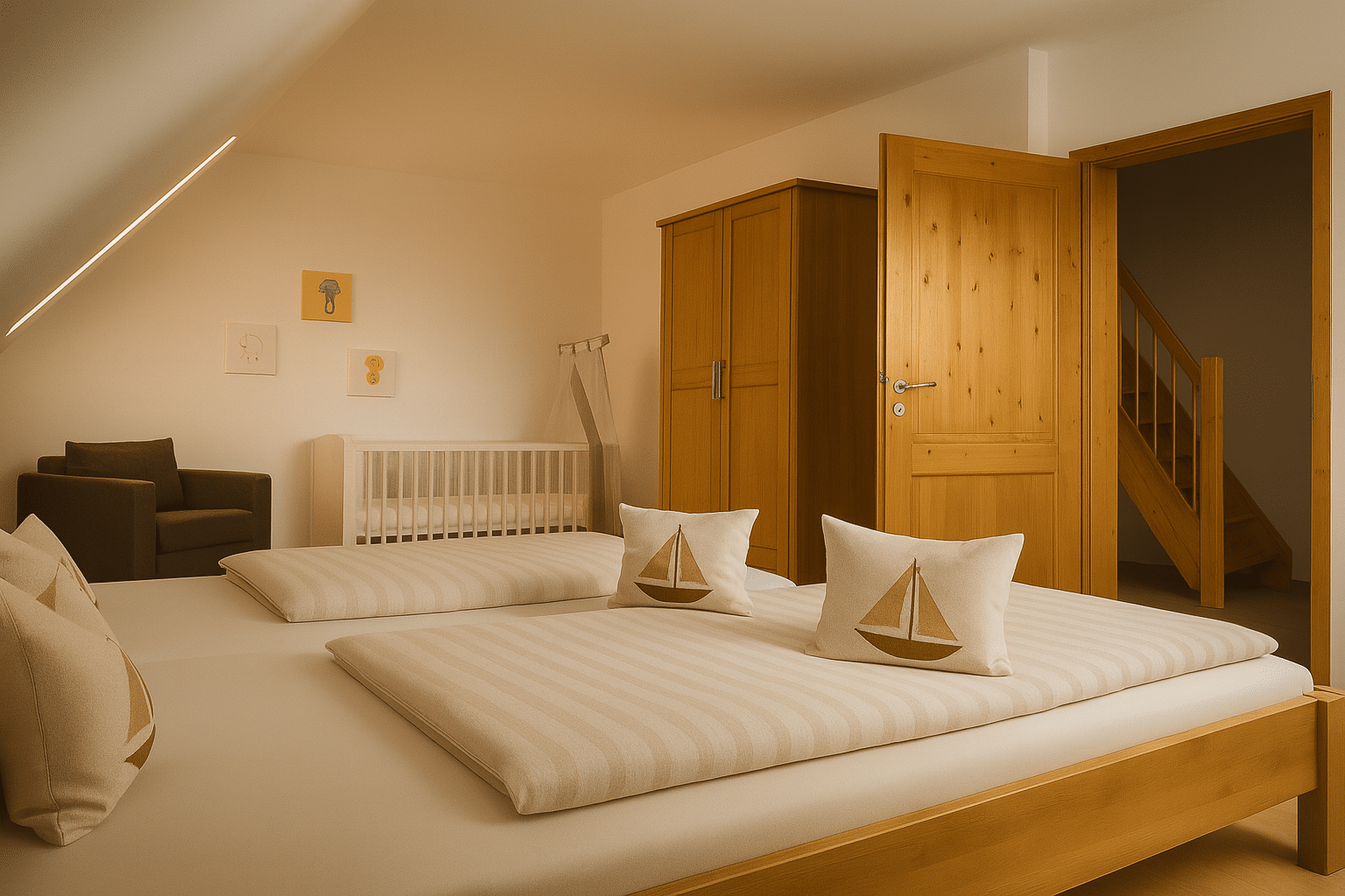 - Großzügiges Elternschlafzimmer mit Doppelbett (1,80 x 2,00 Meter) in Komfort-Höhe, verstellbare Lattenroste und hochwertige Matratzen.